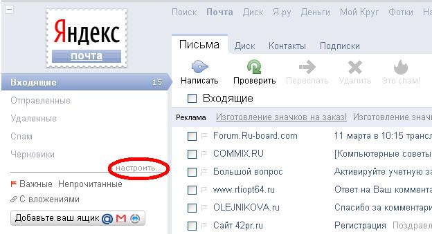 ШАГ.1 Зайти на свой почтовый ящик «Яндекс почта» и как показано на рисунке ниже, нажимаем на пункт настроить…
