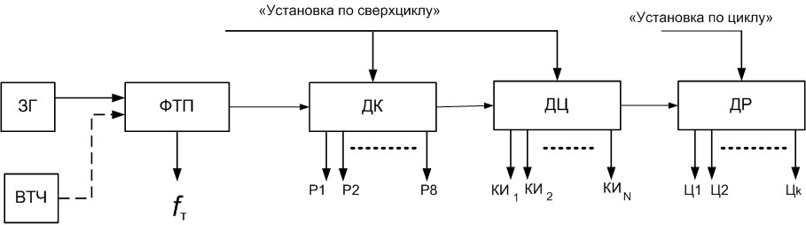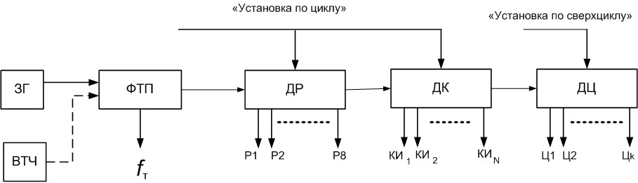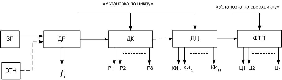 Функциональная схема генераторного оборудования ЦСП имеет вид (ЗГ – задающий генератор, ВТЧ – выделитель тактовой частоты, ФТП – формирователь тактовой последовательности, ДР – делитель разрядный, ДК – делитель канальный, ДЦ – делитель цикловой):